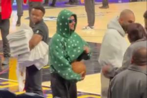 贾斯汀·比伯此前来到湖人现场观赛,拿着篮球试图藏怀里顺走,最终被现场安保“逮捕”归还。