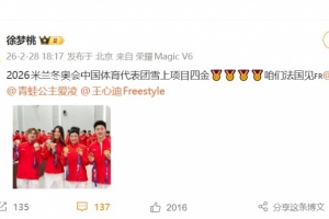徐梦桃写道:2026米兰冬奥会中国体育代表团雪上项目四金🥇🥇🥇🥇咱们法国见。