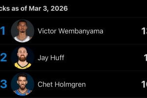 本赛季至今,文班送出138次盖帽领跑全联盟,他仅用了47场比赛,比第二的赫夫(61场,117次)少14场,比第三的霍姆格伦(55场,109次)少8场。