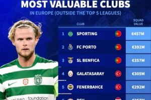 欧洲非五大联赛球队身价排名:葡超土超荷甲霸榜,英冠伊镇在列