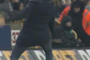 水晶宫在下半场6分钟2球完胜狼队,主帅格拉斯纳在场边激情庆祝差点滑倒,随后他顺势转圈握拳鼓劲。