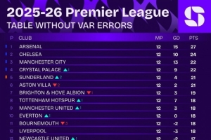 体育资讯11月26日讯 数据网站Squawka票选了本赛季英超每周最具争议的VAR判罚,并列出了若无VAR误判的英超积分榜。