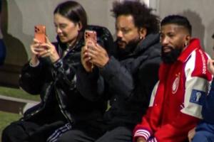 16岁的恩佐·阿尔维斯在第79分钟替补登场,镜头给到场边的父亲马塞洛,后者正在用手机拍下儿子首秀的瞬间。
