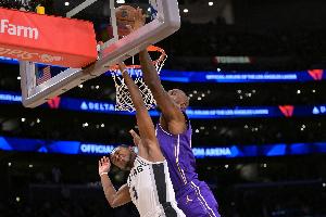 马刺的进攻思路很明确,福克斯突小里,卡斯尔莽东契奇,持球生突就能轻松杀入腹地,迫使湖人收缩协防——单刀突刺,团队分享球,空位三分扫射