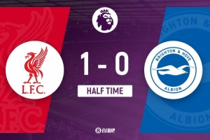 半场-利物浦1-0布莱顿 埃基蒂克46秒闪击戈麦斯伤退萨拉赫替补