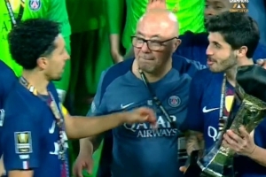 赛后庆祝时发生了有趣的一幕,队友们轮流捧起奖杯,而巴黎边卫努诺·门德斯与资深装备管理员纳赛尔丁开玩笑,多次把后者的光头当作奖杯捧起。