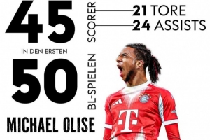 体育资讯1月12日讯 拜仁在本轮德甲焦点战8-1血洗沃尔夫斯堡,奥利塞独造3球。