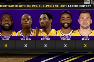湖人队史单场至少25分10助&命中3记三分场次:詹姆斯6次最高;东契奇,拉塞尔,科比,范埃克塞尔皆3次